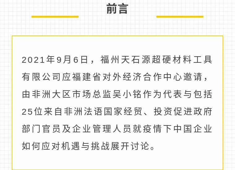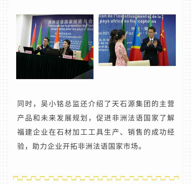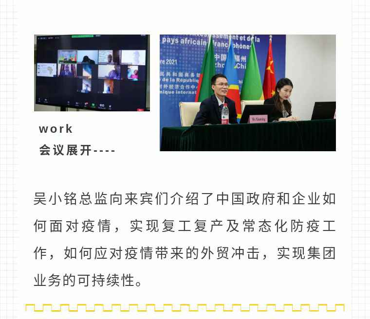 2021年9月6日,九游网页版登录入口-九游(中国)应福建省对外经济合作中心邀请,由非洲大区市场总监吴小铭作为代表与包括25位来自非洲法语国家经贸、投资促进政府部门官员及企业管理人员就疫情下中国企业如何应对机遇与挑战展开讨论。